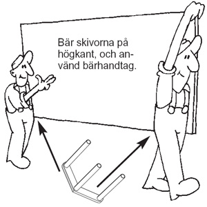 För att undvika onödiga interntransporter bör gipsskivor och tillbehör placeras så nära montageplatsen som möjligt. Ofta är det nödvändigt med transport från en central lagringsplats till monteringsplatsen. Den måste naturligtvis göras så att materialen inte skadas. Gipsskivorna bärs på högkant och gärna med hjälp av bärhandtag. Det är inte något enmansjobb, eftersom skivorna, beroende av typ och tjocklek, väger 6–14 kg per m2. Det motsvarar 22–50 kg för en skiva med längden 3000 mm. Skivorna skall alltid lyftas från pallen. Drar man av dem kan kartongen skadas. Sätt aldrig ner skivorna hårt på kanterna eller hörnen. | |