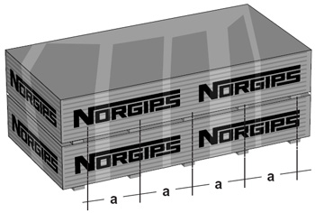 Skall skivorna lagras länge, ute eller inne, måste man räkna med hög fuktighet. Skivorna skall då ligga på plant underlag upphöjt från golv eller mark. I praktiken innebär det att de ska ligga på pall. Om fler pallar staplas på varandra måste mellanläggen placeras rakt ovanför varandra. Vid förvaring ute måste man givetvis täcka skivorna med plast eller presenning och det måste finnas möjlighet för luftning mellan skivorna och övertäckningen. Norgips kan leverera plasthuvar för att användas som extra väderskydd på byggarbetsplatsen eller lager. Kontrollera regelbundet att inte kondens/fukt bildas/samlas i paketen innanför plasten, kontroll bör göras minst 1 gång per dag. Felaktig förvaring kan medföra försämring av kvaliteten på slutresultatet. I fuktigt tillstånd är gips ett plastiskt material. Det betyder att en skiva deformeras om den är fuktig och torkar i detta skick. I praktiken är det omöjligt att rätta till den igen. |